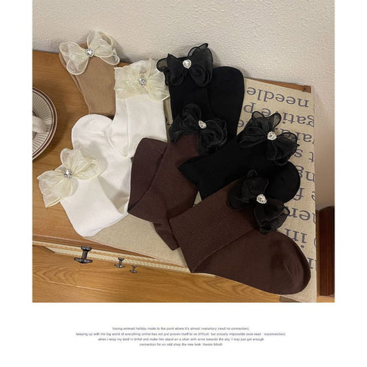 Chaussettes hautes unies à strass et nœud en maille en forme de cœur