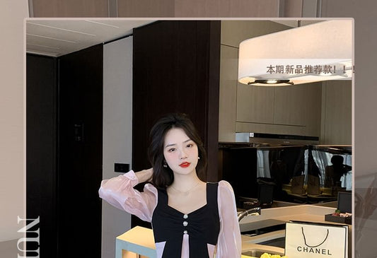 Long-Sleeve Square Neck Two Tone Bow Satin Mini A-Line Dress