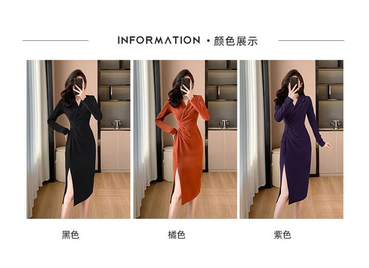 Long-Sleeve V-Neck Plain Side-Slit Ruched Midi Sheath Dress