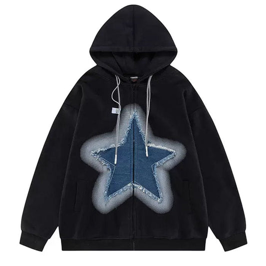Sweat à capuche zippé en denim Y2K avec étoiles