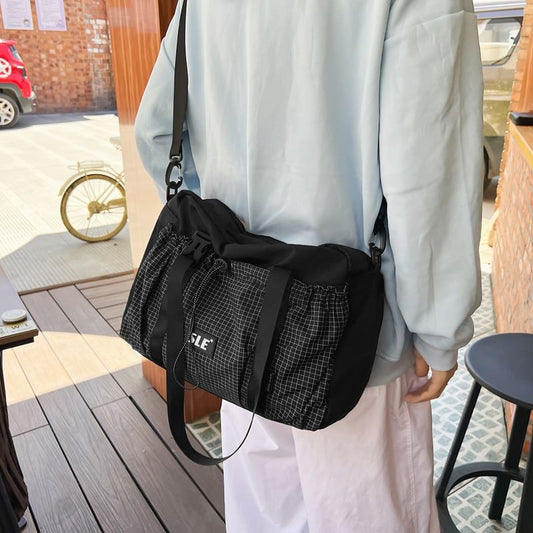 Plaid Drawstring Panel Buckled Bag Crossbody