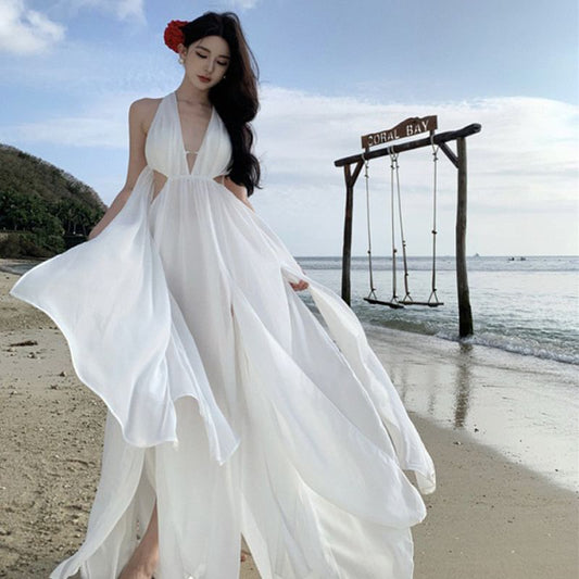 Open Sundress Back Lace-Up Maxi Plain Spaghetti Strap