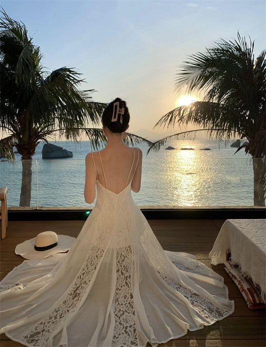 Maxi Open Back Spaghetti Plain Lace Sundress Strap Panel
