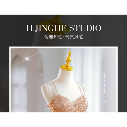 Robe de soirée trapèze à bretelles spaghetti et empiècement en sequins