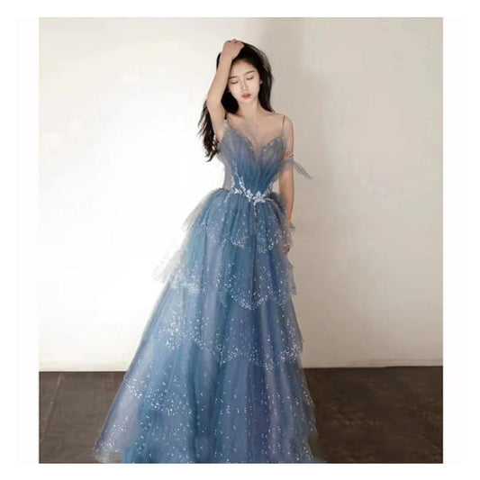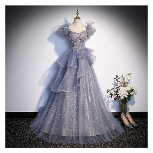 Robe de soirée trapèze à volants et paillettes à épaules dénudées