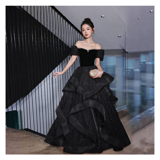 Robe de soirée trapèze en velours à manches courtes et épaules dénudées avec empiècement à volants et strass scintillants