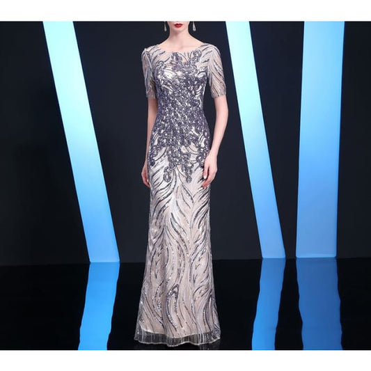 Robe de soirée trompette à paillettes à manches courtes et col rond