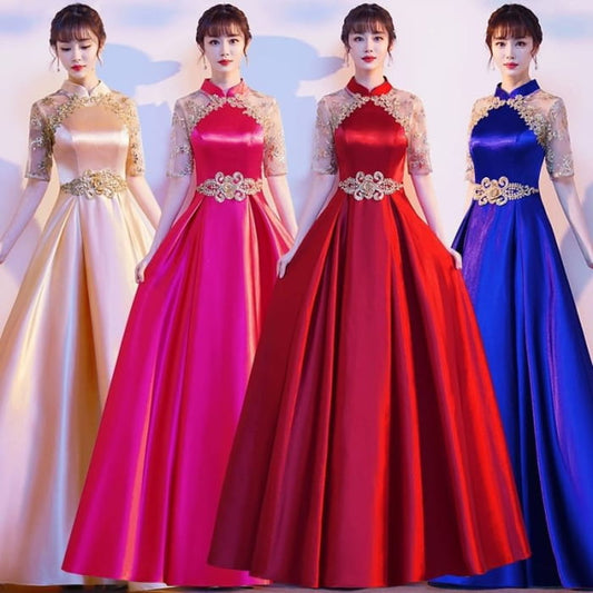 Robe de soirée trapèze à manches 3/4 et épaules dénudées avec strass et fleurs