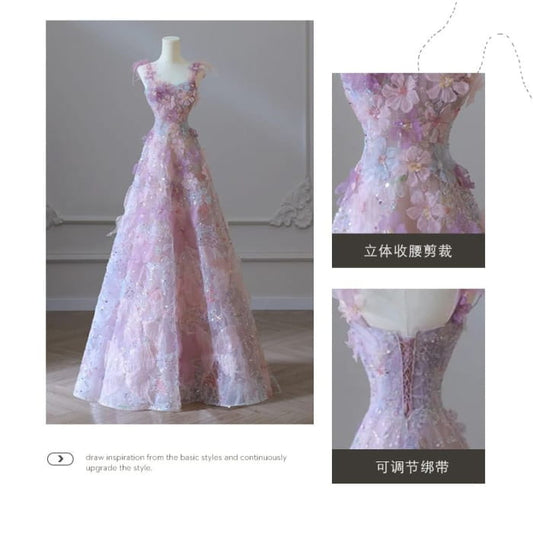 Robe de soirée trapèze à appliques florales et épaules nouées