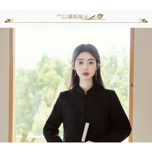 Chemisier traditionnel chinois à manches courtes et col montant en jacquard à fleurs boutonnées / Jupe trapèze mi-longue boutonnée à taille haute en grenouille unie / Ensemble
