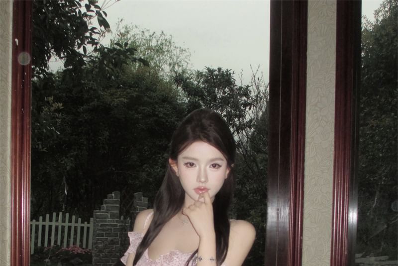 V-Neck Cold Shoulder Dotted Ruffle Trim Tie Front Slit Maxi A-Line Dress