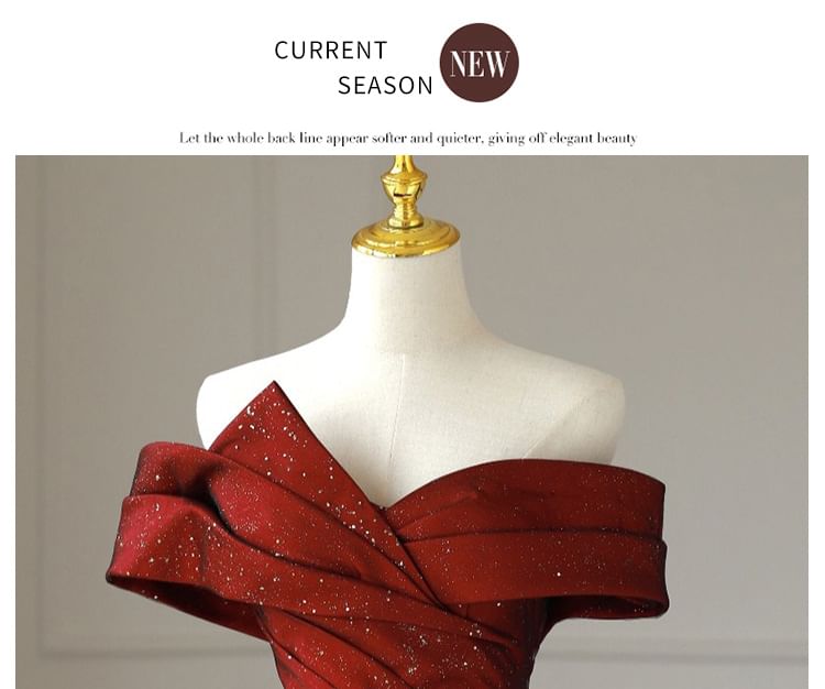 Asymmetrical Evening Gown Off-Shoulder Glitter Mesh A-Line Panel