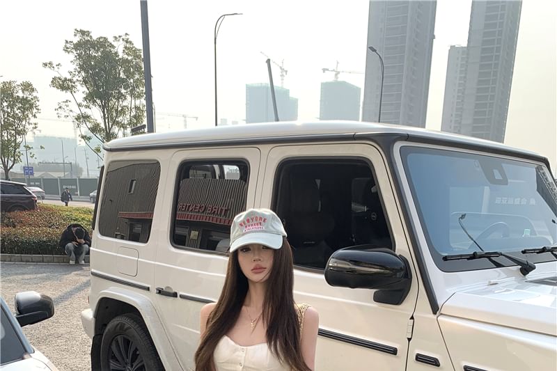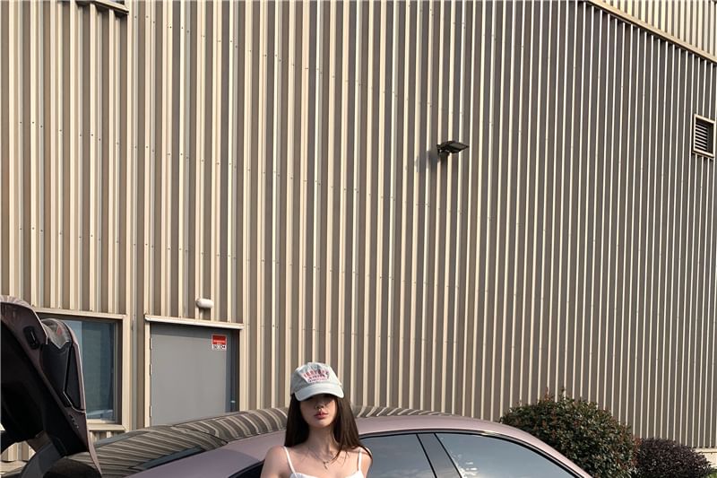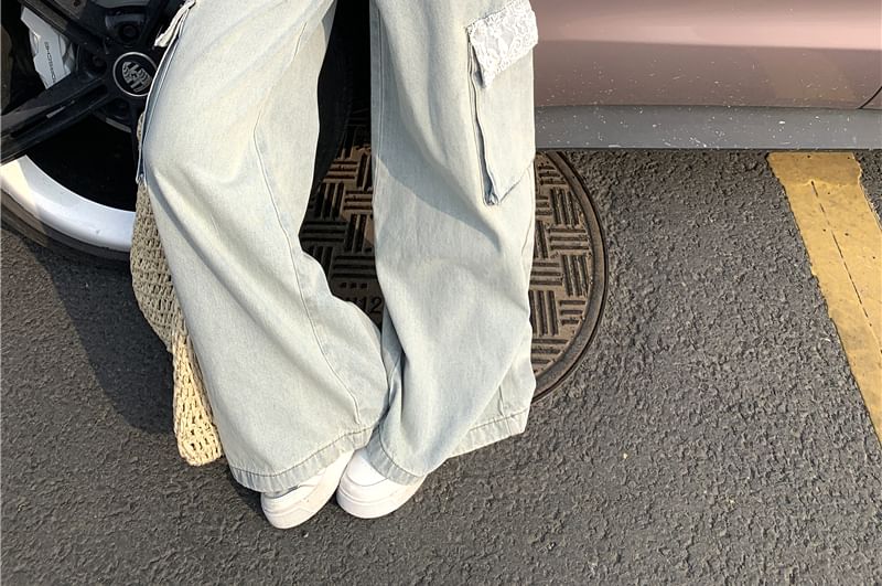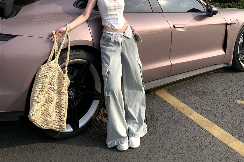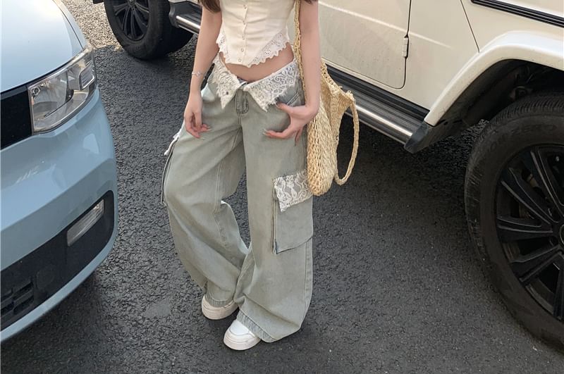 Camisole / Lace Jeans Crop Top Washed Rise Panel Trim Wide Low Button-Up Leg Cargo