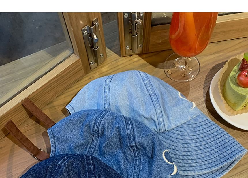 Bow Embroidered Washed Denim Wide Brim Cap