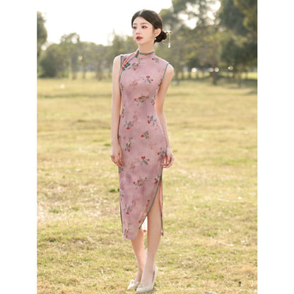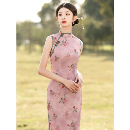 Cheongsam long sans manches à fleurs de cerisier