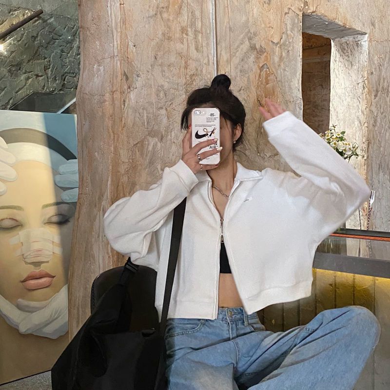 Collared Plain Applique Zip-Up Waffle Jacket Crop