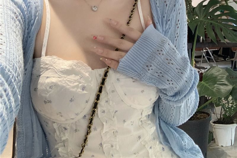 Spaghetti Strap Floral Print Ruffle Mini A-Line Dress / Plain Pointelle Cardigan