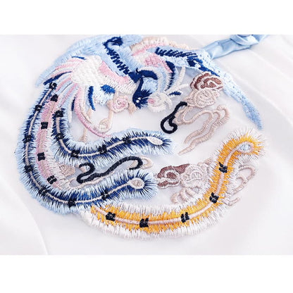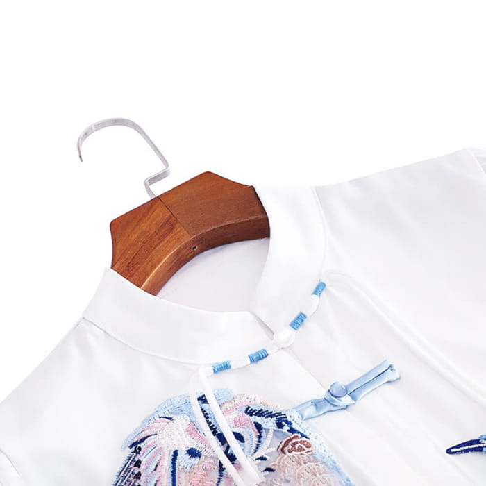 Ensemble élégant avec chemise à pompons et jupe à imprimé oiseau