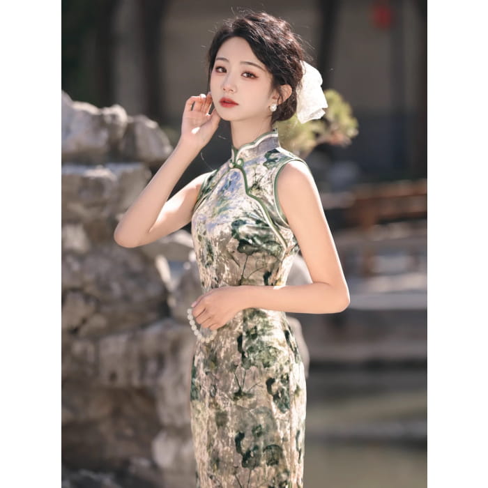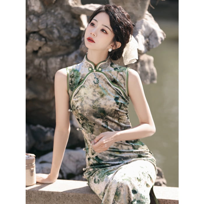 Cheongsam long sans manches élégant de la forêt