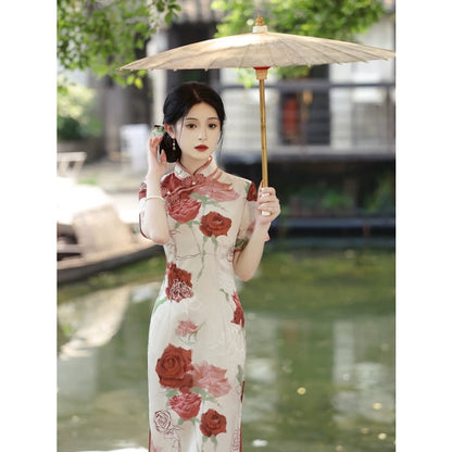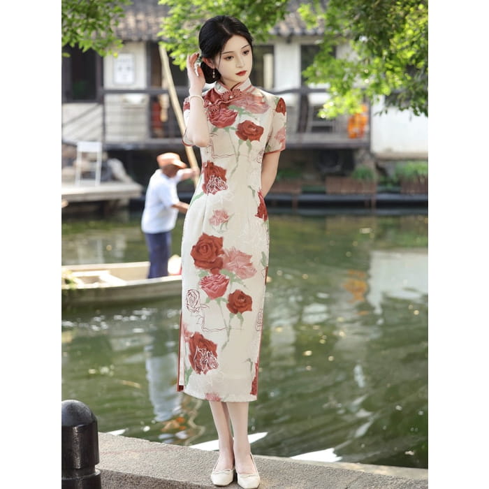Découvrez l'élégance et la sophistication avec notre élégante robe cheongsam rose. Dotée d'un superbe motif de roses, cette robe respire le charme intemporel. Avec son design complexe et sa coupe flatteuse, elle rehaussera votre style et vous fera sortir du lot en toute occasion. Embrassez votre beauté intérieure avec cette robe incontournable.