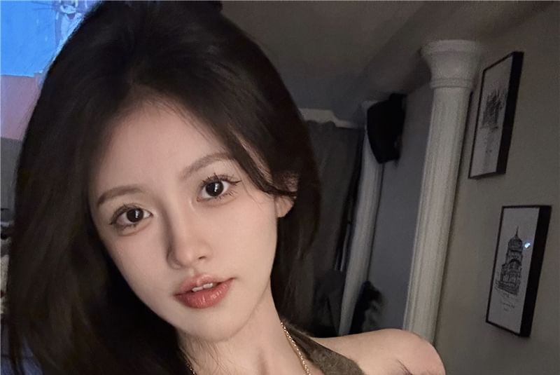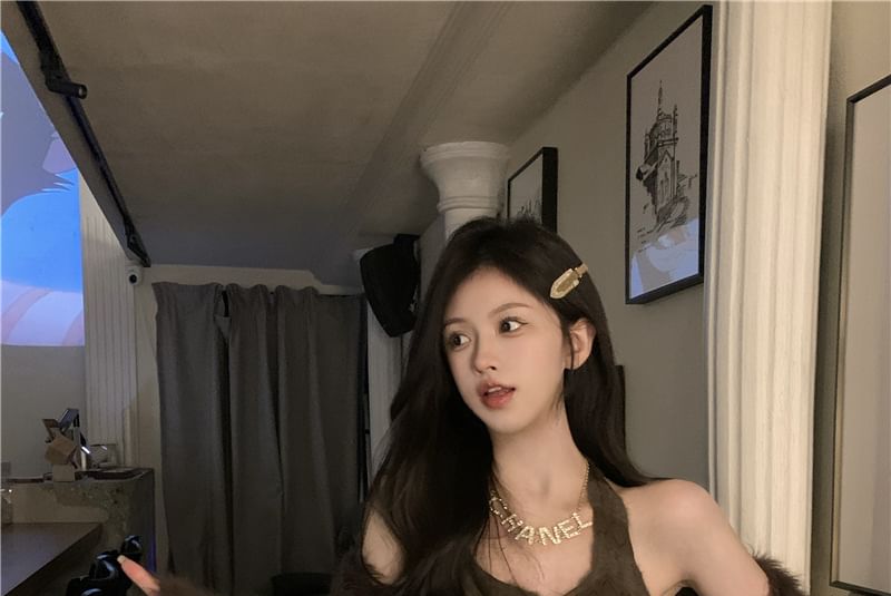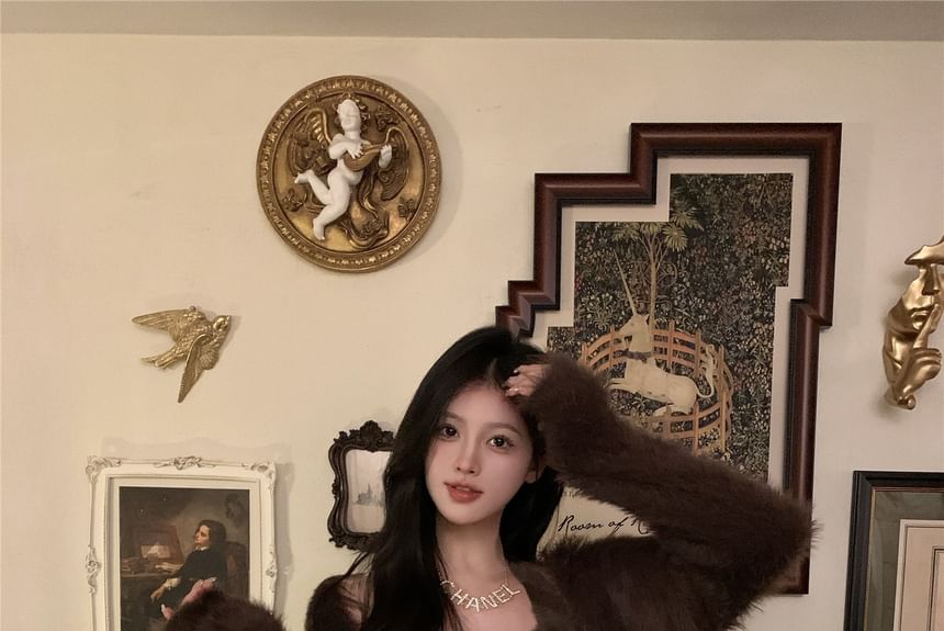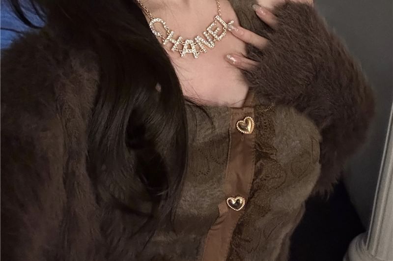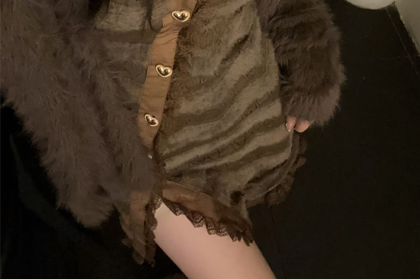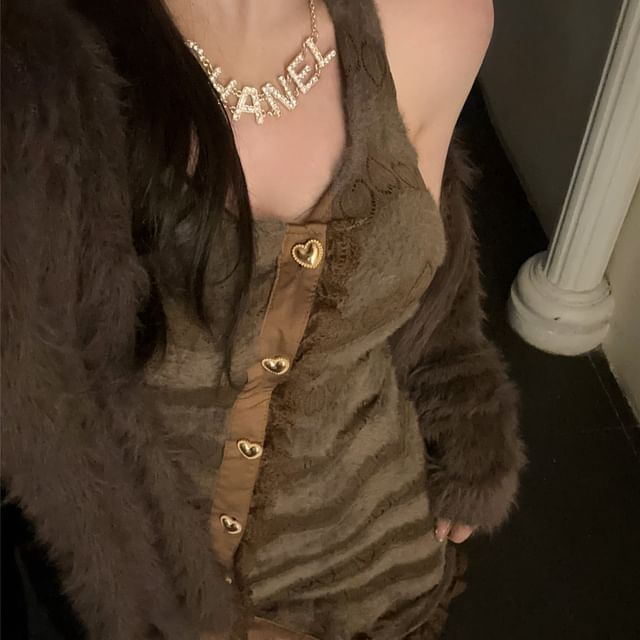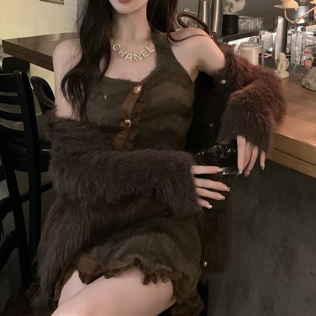 Halter Neck Asymmetrical Lace Trim Heart Buttoned Mini Bodycon Dress / Plain Fluffy Cardigan