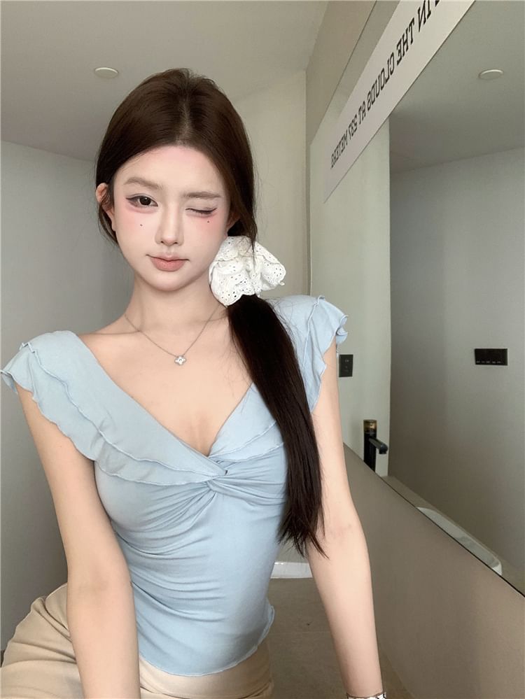 Cap-Sleeve V-Neck Plain Knot T-Shirt