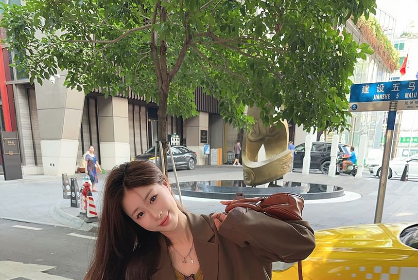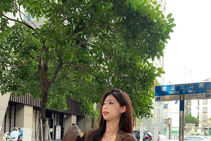 Lapel Collar Plain Single Breasted Blazer / Mid Waist Plain Mini A-Line Skirt / Long-Sleeve Scoop Neck Plain Tee