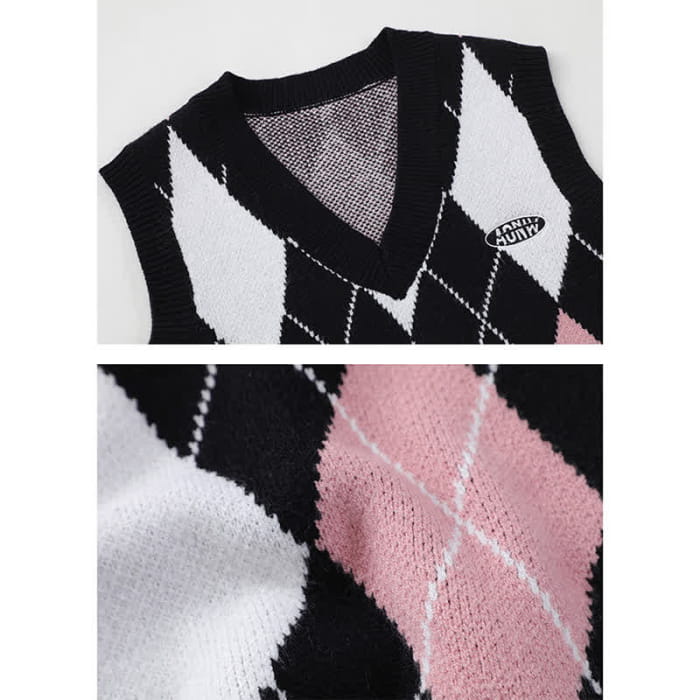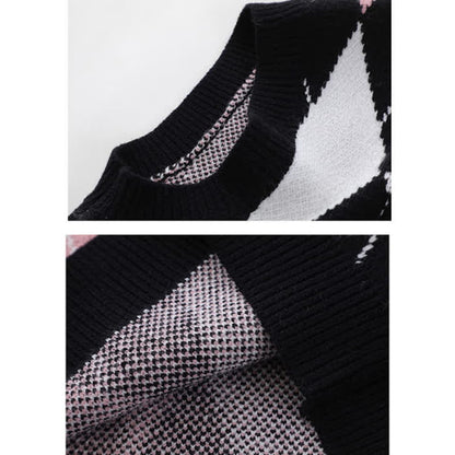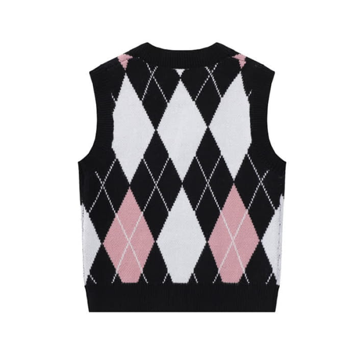 Gilet à imprimé losanges rose, chemise à manches longues, jupe plissée