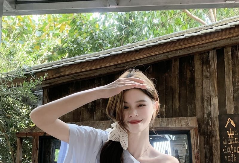 Set: Sleeveless One Shoulder Plain Blouse + Belt