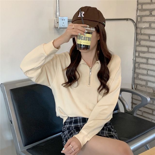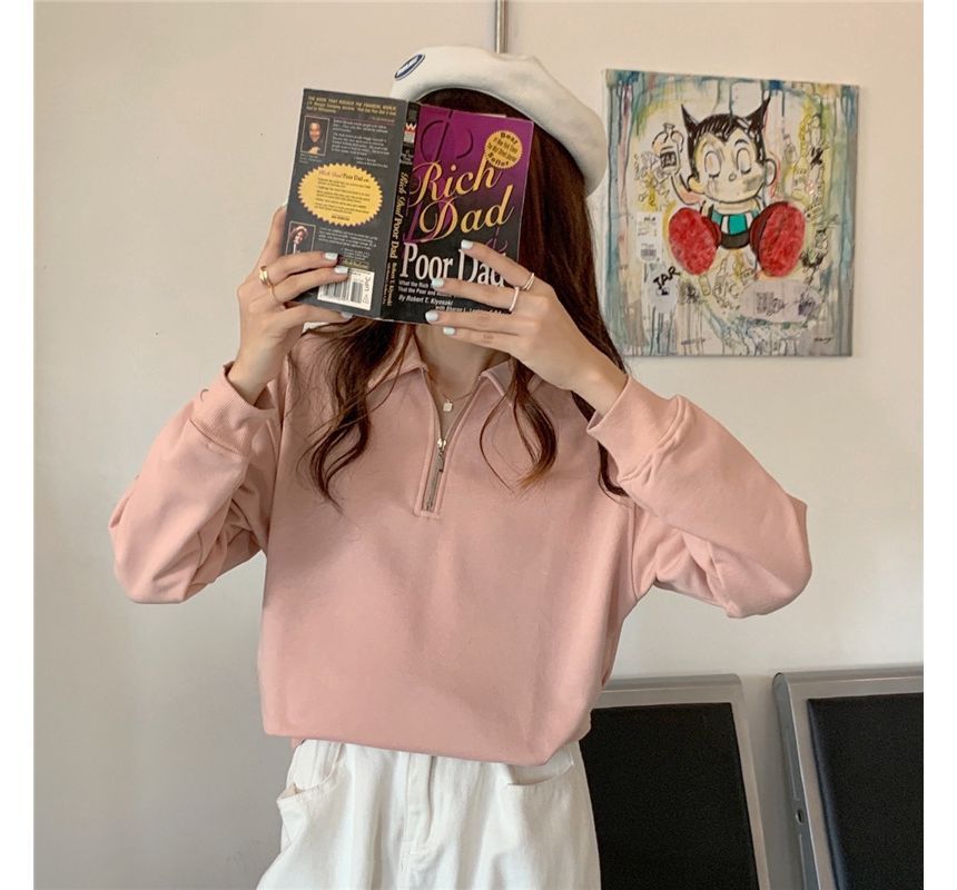 Plain Long-Sleeve Sweatshirt Polo-Neck Half-Zip