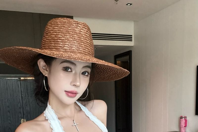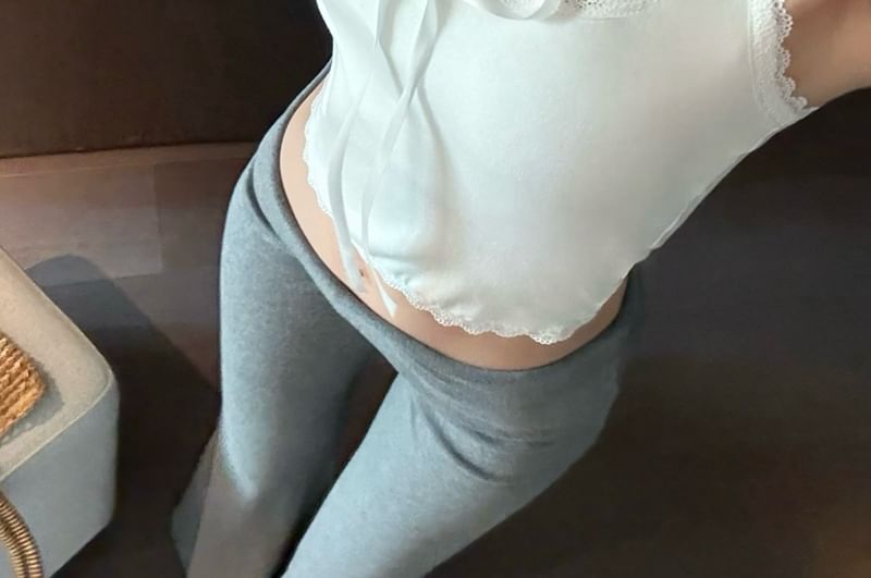 Plain Neck Scoop Trim Halter Top Cropped Bow Lace