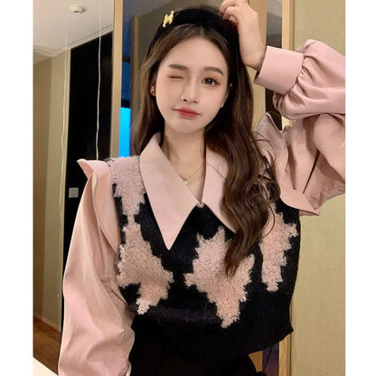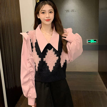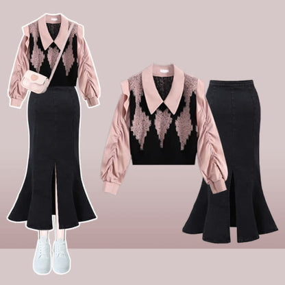 Chemise à imprimé losanges et jupe en queue de poisson en jean