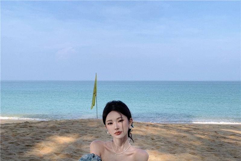Puff-Sleeve Off-Shoulder Floral Print Ruffle Trim Slit Maxi A-Line Dress