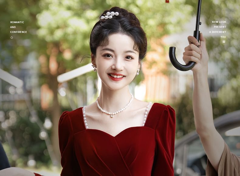 Square Panel A-Line Velvet Dress Neck Evening Gown Long-Sleeve Jacquard / Cocktail