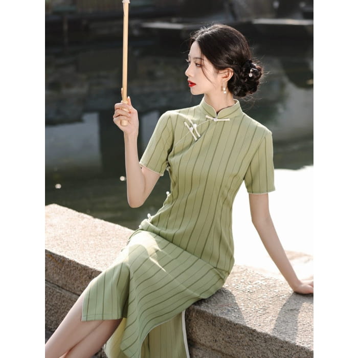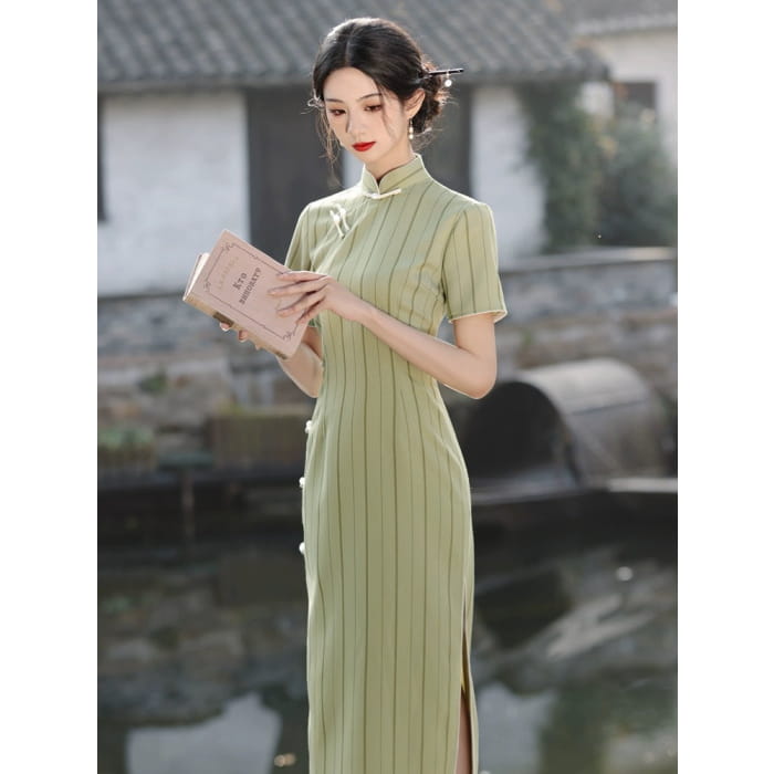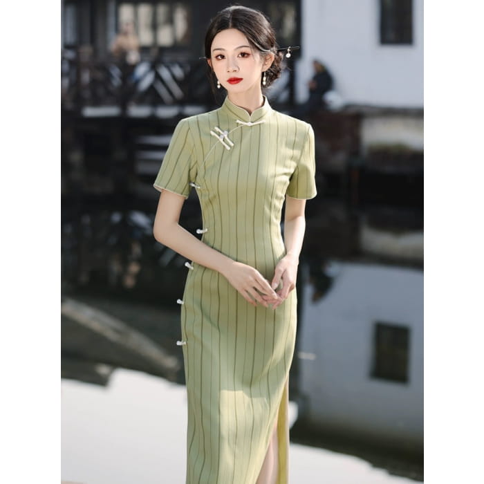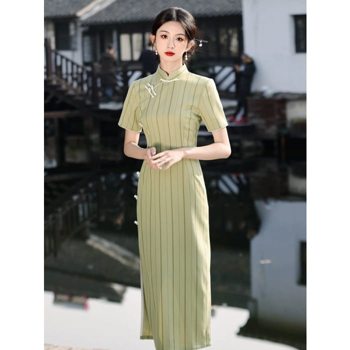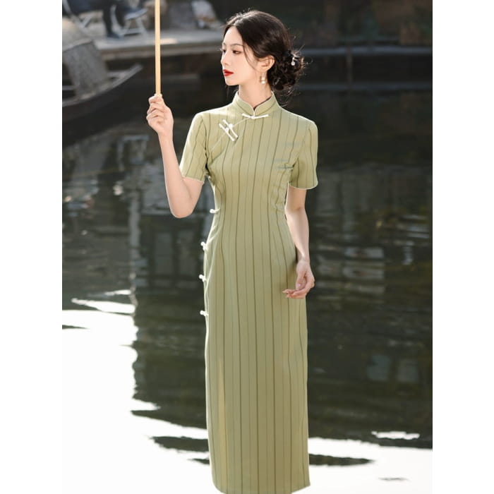 Rehaussez votre style avec notre élégante robe longue cheongsam à rayures et manches courtes. Cette magnifique robe présente un imprimé à rayures audacieux et des manches courtes confortables, ce qui la rend parfaite pour toutes les occasions. Sortez avec sophistication et faites tourner les têtes partout où vous allez.