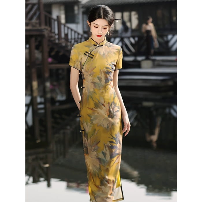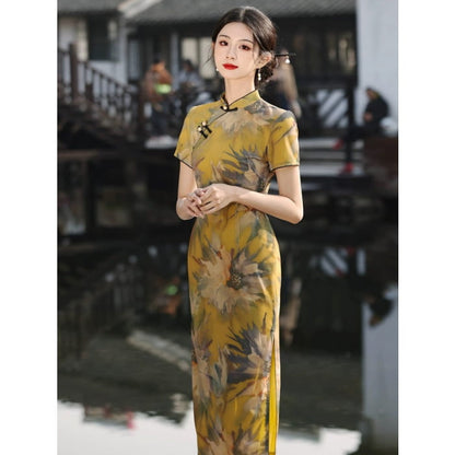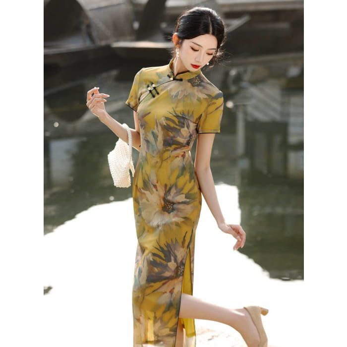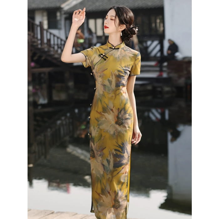 D'une élégance naturelle, le cheongsam long à manches courtes Sunflower est un incontournable pour toute garde-robe. Avec son design saisissant en forme de tournesol et ses manches courtes confortables, ce cheongsam offre à la fois style et facilité. Parfait pour toutes les occasions, c'est une véritable pièce de déclaration.