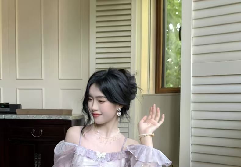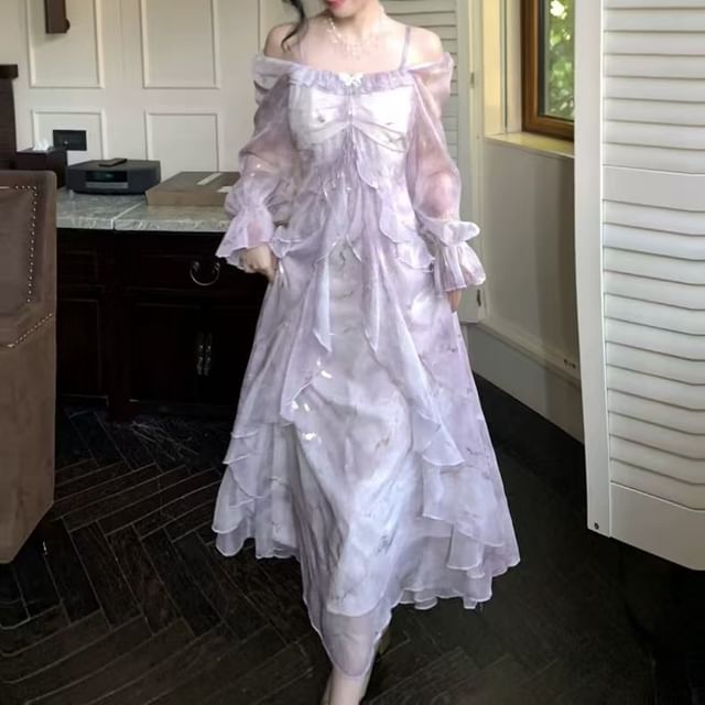 Long-Sleeve Cold Shoulder Tie Dye Butterfly Accent Ruffle Trim Maxi A-Line Dress