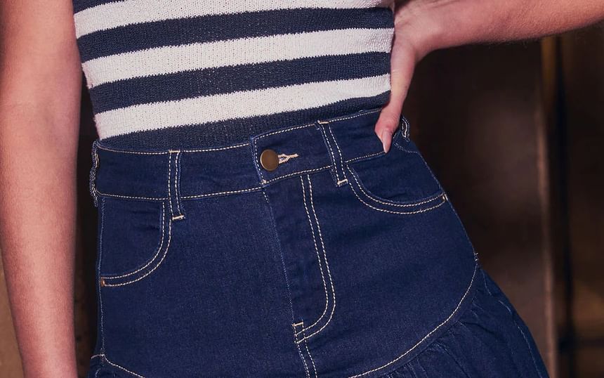 Long Sleeve Washed Zip-Up Cropped Denim Jacket / High Waist Mini A-Line Denim Skirt