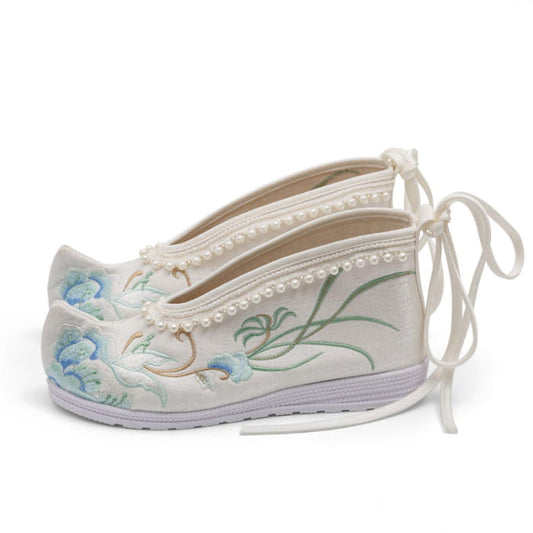 Chaussures plates à imprimé floral brodé vintage avec bordure en perles