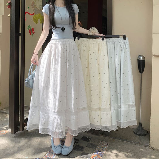Waist Skirt Lace Elastic A-Line Panel Floral Midi