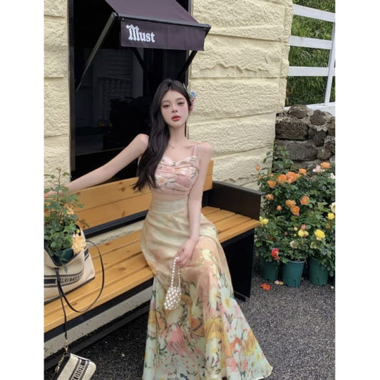 Ensemble : haut court à imprimé floral et jupe trapèze longue taille haute