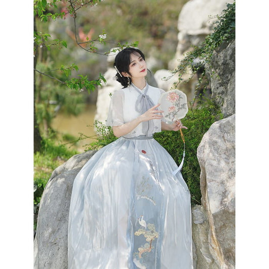 Ensemble : chemisier long Hanfu brodé de fleurs + haut caraco + jupe longue + écharpe