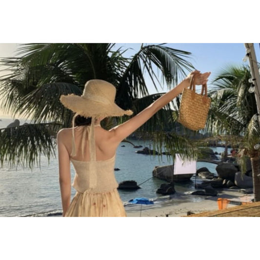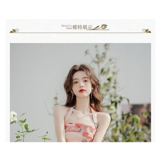 Ensemble : haut court uni à col licou + jupe longue à imprimé floral taille haute