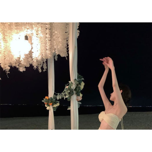 Set: Halter Lace Trim Camisole Top + Wide Leg Shorts