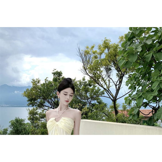 Ensemble : haut uni froncé à fente et licou + maxi à empiècement taille haute