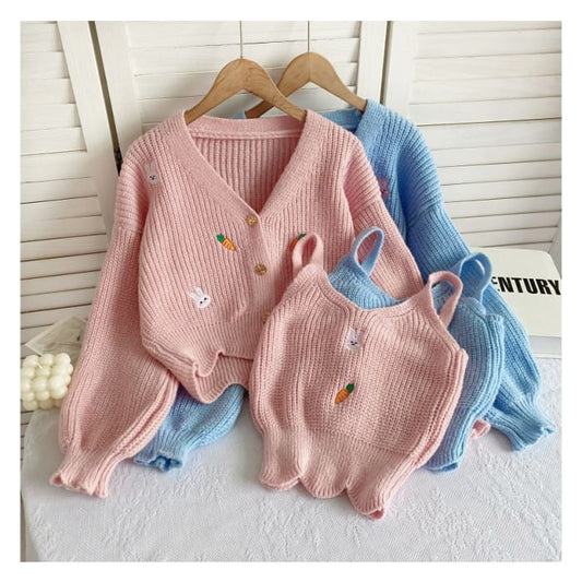 Ensemble : haut camisole en tricot brodé lapin + cardigan boutonné à col en V