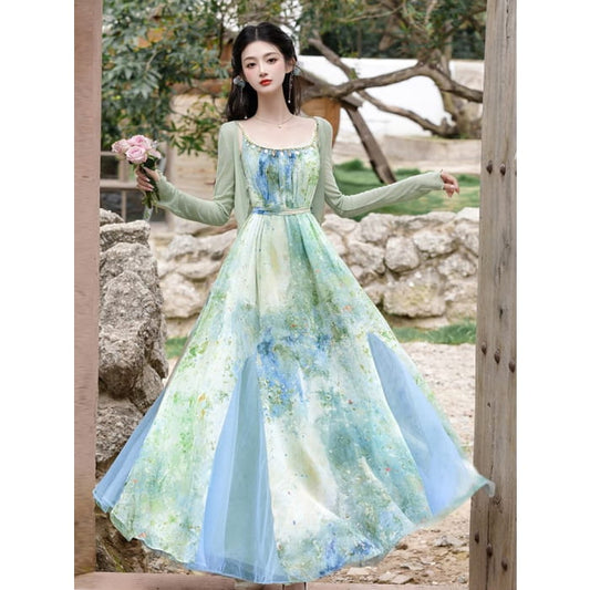 Ensemble : Maxi Hanfu fleuri à bretelles spaghetti