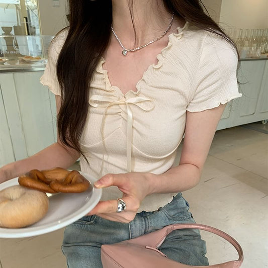 Short-Sleeve Knit Neck Button Plain Faux Square Pearl Drawstring Top