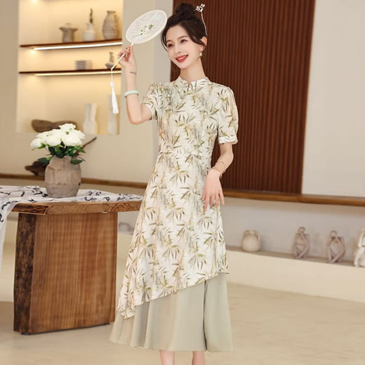 Short-Sleeve Lace Trim Floral Print Maxi Qipao Dress