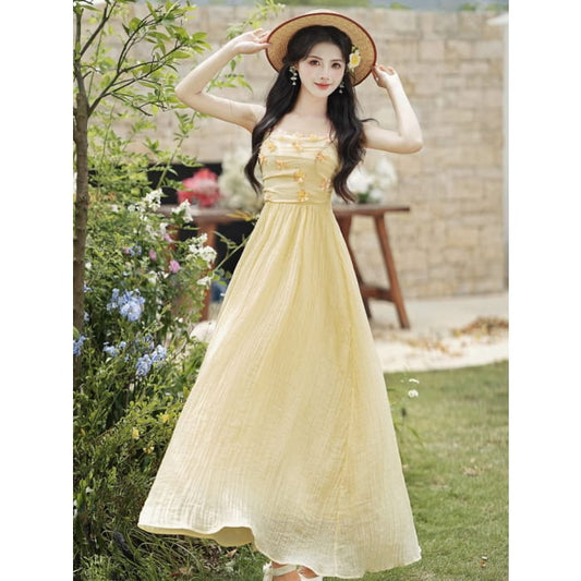 Robe mi-longue à bretelles spaghetti et accents floraux